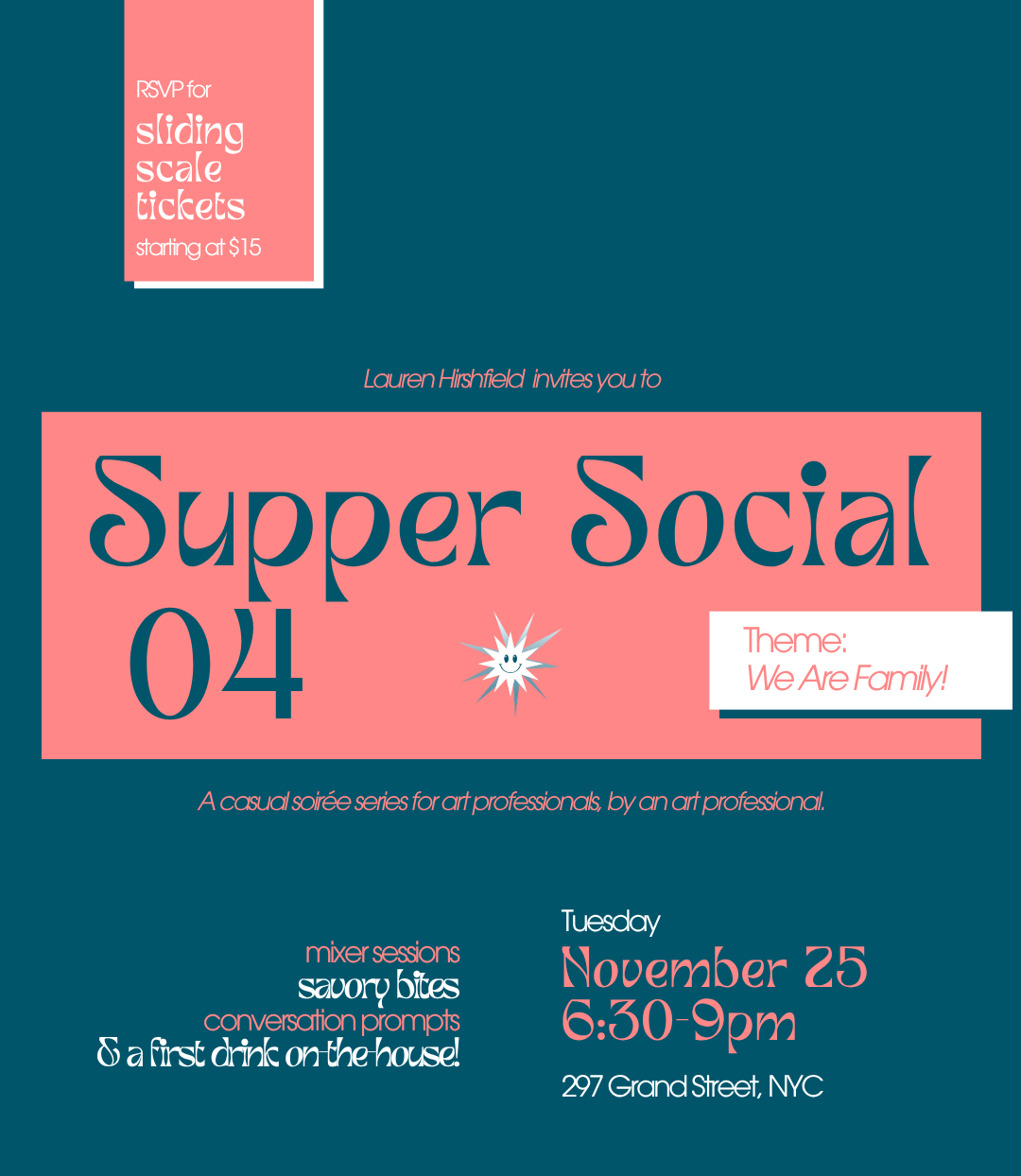 Supper Social started in summer 2025 as an antidote to the cycle of too crowded, too loud, and too late art world happenings. This one's for all the advocates and facilitators who make the ecosystem go 'round - curators, gallerists, advisors, writers, producers, art handlers, fabricators, etc. (Artists & patrons are welcome too!)